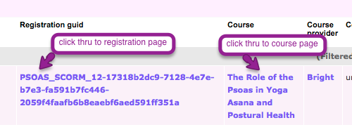 When viewing a registration, for SCORMCloud registrations you can click thru to the associated SCORMCloud registration or course pages, respectively.