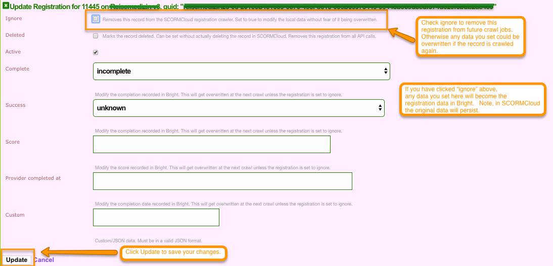 - you MUST set the record to ignore, so that Bright will never attempt to update the record from SCORMCloud again.